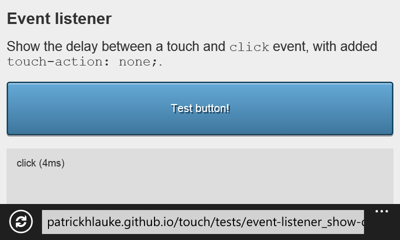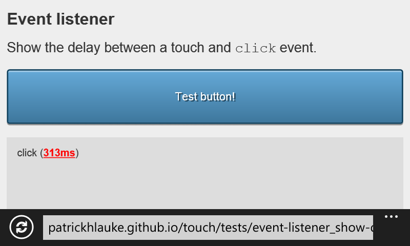 Wie schon letztes Jahr gesehen, gibt es bei Touchscreens in der Regel eine Verzögerung von ungefähr 300ms zwischen dem Moment, in dem der Finger bei einem »Tap« den Touchscreen verlässt, und dem click Event. Um bei Touch-Events diese Verzögerung zu umgehen, müssen sich Entwickler traditionell mit extra Code auseinandersetzen, der sowohl auf touchend (der direkt vor der Verzögerung ausgeführt wird) als auch auf click reagiert, und mittels preventDefault() verhindern, dass die gleiche Funktion doppelt abläuft – einmal für den Touch-Event, und danach für die simulierten Maus-Events.