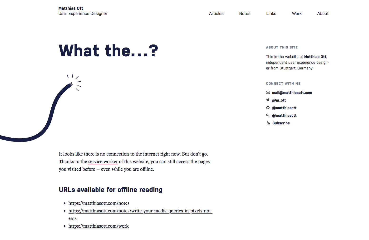 - Sofern der Benutzer offline ist und ein noch nicht gecachtes Dokument besucht, soll eine eigene Fehlerseite ausgegeben werden.